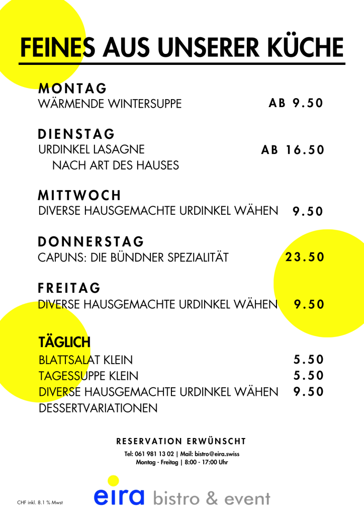 Das eira bistro & event freut sich, Sie von Montag bis Freitag, 8:00 – 17:00 Uhr begrüssen zu dürfen.